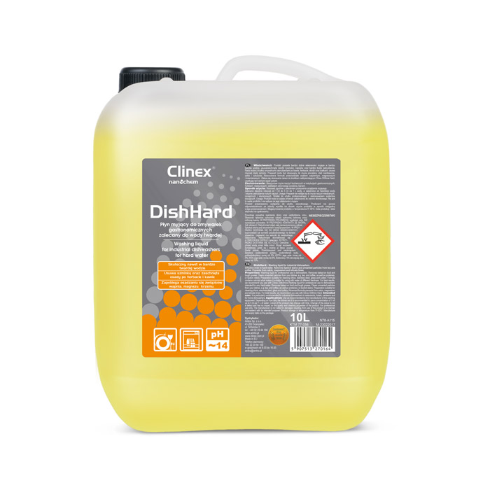 Υγρό επαγγελματικών πλυντήριων πιάτων σε συνθήκες πλύσης με πολύ σκληρό νερό. Αφαιρεί τα καμμένα υπολείμματα φαγητού και το σκληρό λίπος. Καθαρίζει τα δυσκολους ρύπους όπως τσάι και καφέ, καθώς και πρωτεΐνες ή λεκέδες από κραγιόν. Προϊόν κατάλληλο για τον καθαρισμό πορσελάνης, ανοξείδωτων, γυαλιού και μαχαιροπίρουνων. Η προηγμένη φόρμουλα παρεμποδίζει την δημιουργία αλάτων ασβεστίου, μαγνησίου. Για καλύτερα αποτελέσματα, σας συνιστούμε να χρησιμοποιήσετε με το Clinex ShineHard.
