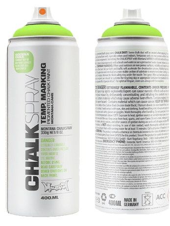 Το CHALKSPRAY είναι μια βαφή κιμωλίας που είναι ιδανική για υπαίθρια σήμανση (προσωρινή μόνο σε μη πορώδεις επιφάνειες). Διατίθεται σε 10 ισχυρές χρωματικές αποχρώσεις με βαθιά ματ και υψηλή επένδυση. Το Montana CHALKSPRAY μπορεί να εφαρμοστεί σε διάφορες επιφάνειες. Ανάλογα με τις καιρικές συνθήκες και το κλίμα, η υπαίθρια σήμανση διαρκεί από αρκετές εβδομάδες έως αρκετούς μήνες. Ξεθωριάζει γρηγορότερα κατά τη διάρκεια εκτεταμένων περιόδων βροχής ή σε περιοχές με υψηλή κυκλοφορία. Σε μη πορώδεις επιφάνειες όπως γυαλί ή μέταλλο οι χρωστικές μπορούν να αφαιρεθούν. Η αφαίρεση από πορώδεις επιφάνειες μπορεί να είναι δύσκολη. Συνιστάται η δοκιμαστική εφαρμογή και αφαίρεση σε ένα μη ορατό τμήμα του υποστρώματος όταν εργάζεστε σε μια μη πορώδη επιφάνεια. Το Montana CHALKSPRAY εντυπωσιάζει από την αίσθηση και την εμφάνισή του – το τυπικό τραχύ αποτέλεσμα κιμωλίας. Η CHALK έχει πολύ ιδιαίτερη αισθητική – και η Montana CHALKSPRAY φέρνει αυτές τις αισθητικές σε ένα σπρέι που λειτουργεί σε πολλές επιφάνειες! Ανάλογα με τις καιρικές συνθήκες και το κλίμα, η υπαίθρια σήμανση διαρκεί από αρκετές εβδομάδες έως αρκετούς μήνες. Το Montana CHALKSPRAY λειτουργεί επίσης καλά σε καμβά, χαρτόνι ή άλλα ασταρωμένα εδάφη λόγω της εξαιρετικής κάλυψης. Το CHALKSPRAY θα γίνει μόνιμο όταν σφραγίζεται με βερνίκι (όταν χρησιμοποιείται σε καμβά, δηλαδή). Επιτρέπει επίσης την περαιτέρω εφαρμογή με πινέλο, ξύστρα ή άλλα εργαλεία. Για καθαρές και ακριβείς γραμμές, συνιστούμε να χρησιμοποιήσετε τα καπάκια Montana LeveL 3 έως 6 (3 και 4 για λεπτές και μεσαίες γραμμές, 5 και 6 για ευρείες γραμμές και πλήρωση μεγάλων περιοχών). Σημείωση εφαρμογής: Κάποια σκόνη κιμωλίας θα δημιουργηθεί κατά τον ψεκασμό. Φορέστε αναπνευστική μάσκα για να αποφύγετε την εισπνοή σκόνης ή χρωστικών κιμωλίας. Συνιστάται να καλύψετε καλά τα γύρω αντικείμενα και τις επιφάνειες. Για αφαίρεση: Σε εξωτερικούς χώρους: Τρίψτε δυνατά με μια βούρτσα και νερό ή χρησιμοποιήστε καθαριστικό νερού υπό πίεση. Προτείνουμε να δοκιμάσετε πρώτα σε μια μη ορατή περιοχή της επιφάνειάς σας για να ελέγξετε την ευκολία της αφαίρεσης.