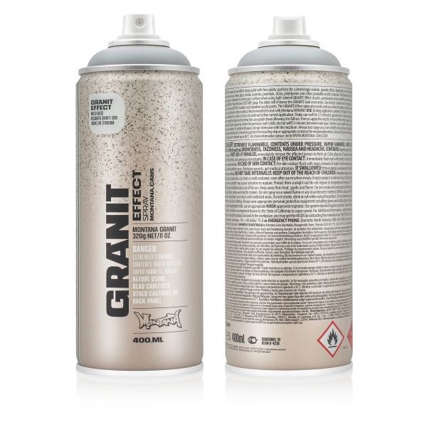 Βαφή ψεκασμού ειδικού εφέ με βάση το νερό με λεπτά πλαστικά σωματίδια για ένα ρεαλιστικό ρεαλιστικό αποτέλεσμα Δεν συνιστάται για εξωτερική χρήση! Μόνο αδιάβροχο όταν σφραγίζεται με αρκετές στρώσεις Montana VARNISH και σωστή επικάλυψη επιφανείας (Primer). Εφαρμόζεται σε πολλές διαφορετικές επιφάνειες όπως χαρτί, χαρτόνι, ασταρωμένος καμβάς, ξύλο, γυαλί, μέταλλο, κεραμικά, πορσελάνη, πέτρα, πολυστυρόλιο και άλλα βαμμένα ακρυλικά υλικά. Το εφέ GRANIT Montana είναι πολύ υψηλό. Για καλύτερα αποτελέσματα, συνιστάται να αδειάζετε την επιφάνειά σας όταν χρησιμοποιείτε αποχρώσεις από ανοιχτόχρωμο γρανίτη, ιδιαίτερα όταν χρωματίζετε σε σκούρες επιφάνειες. Σας συνιστούμε να χρησιμοποιήσετε το σπρέι Montana PRIMER ή το Montana TEXTURE. Το τελευταίο θα ενισχύσει ακόμη περισσότερο την εμφάνιση γρανίτη. Μπορεί να επικαλυφθεί όταν στεγνώσει καλά. Μπορεί να συνδυαστεί με Montana GOLD, Montana ACRYLIC μαρκαδόρους και τυπικά ακρυλικά χρώματα. Το σπρέι εφέ GRANIT λειτουργεί επίσης καλά ως σπρέι δομής. Επικαλύψτε ελαφρά τις ξηρές περιοχές για να λάβετε την επιθυμητή εμφάνιση γρανίτη. Χρώμα που εμφανίζεται στην κορυφή ή ντόνατ. Συνιστάται να σφραγίζεται με Montana VARNISH. Βεβαιωθείτε ότι το εφέ Granit έχει στεγνώσει εντελώς (36-48 ώρες) πριν σφραγιστεί με Montana VARNISH. Διατίθεται σε χρώματα: ανοιχτό γκρι, γκρι, καφέ και μαύρο. Σημείωση: Το GRANIT Black έχει ένα μείγμα πράσινου και μαύρου πλαστικού σωματιδίου για να αναδημιουργήσει την εμφάνιση του πραγματικού γρανίτη. Το Montana GOLD Shock Black θα μπορούσε να εφαρμοστεί ως κορυφαίο παλτό μόλις στεγνώσει εντελώς εάν το επιθυμείτε.