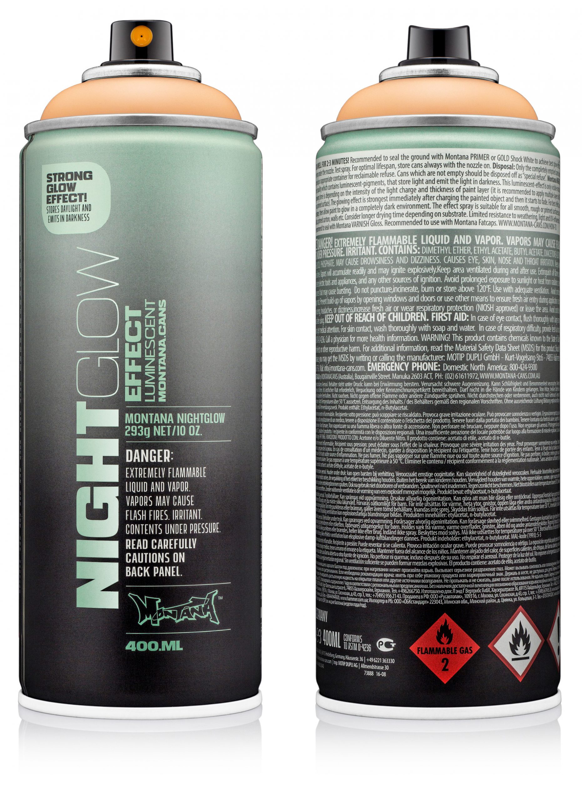 Το νέο βελτιωμένο Montana NIGHTGLOW NG1000, είναι ένα υψηλής ποιότητας, υψηλής ποιότητας νιτρο-ακρυλικό χρώμα. Περιέχει τώρα υψηλότερες εκπομπές φωτός, φωτεινές χρωστικές. Η νέα ποιότητα αποθηκεύει το φως ως φορτισμένη απορροφούμενη ενέργεια και εκπέμπει αυτήν την ενέργεια (ως φως), όταν βρίσκεται σε απόλυτο σκοτάδι. Το τώρα πιο μακράς διάρκειας φωταυγή πράσινο χρώμα, λάμπει στο σκοτάδι. Ο χρόνος που το χρώμα εκπέμπει φως ποικίλλει ανάλογα με την ένταση και το μήκος της έκθεσης στο φως (φόρτιση) και το ποσό της βαφής NIGHTGLOW EFFECT που εφαρμόζεται. Για βέλτιστη λάμψη, συνιστάται η εφαρμογή πολλαπλών στρωμάτων σε προ-ασταρωμένα υποστρώματα. Η υψηλότερη εκπομπή φωτός εμφανίζεται αμέσως μετά τη φόρτιση. Μπορεί να χρησιμοποιηθεί για εσωτερικές και εξωτερικές εφαρμογές. Για καλύτερα αποτελέσματα, χρησιμοποιήστε μια ισχυρή πηγή φωτός για να φορτώσετε το σπρέι NIGHTGLOW EFFECT και να προβάλλετε σε απόλυτο σκοτάδι χωρίς άλλες πηγές φωτός. Το NIGHTGLOW μπορεί να χρησιμοποιηθεί σε λείες, τραχιές και ασταρωμένες επιφάνειες όπως μέταλλο, ξύλο, σκληρά πλαστικά, ασταρωμένο χαρτοκιβώτιο και τοίχοι κλπ. Σας συνιστούμε να εφαρμόσετε σε επιφάνειες που είναι προ-ασταρωμένες με το Montana GOLD Shock WHITE 9100 για να επιτύχετε το πιο έντονο αποτέλεσμα λάμψης. Λάβετε υπόψη ότι ενδέχεται να απαιτείται μεγαλύτερος χρόνος στεγνώματος με την επιφύλαξη του υποστρώματος που εφαρμόζεται. Περιορισμένη αντίσταση στις καιρικές συνθήκες, στις ελαφριές και τις υπεριώδεις επιδράσεις Μόλις στεγνώσει εντελώς και σκληρυνθεί, η μακροζωία και η ανθεκτικότητα του σπρέι NIGHTGLOW EFFECT μπορούν να αυξηθούν εφαρμόζοντας το Montana VARNISH GLOSS 400ml. Συνιστούμε τη χρήση με Montana Fat Caps (π.χ. μαύρο)