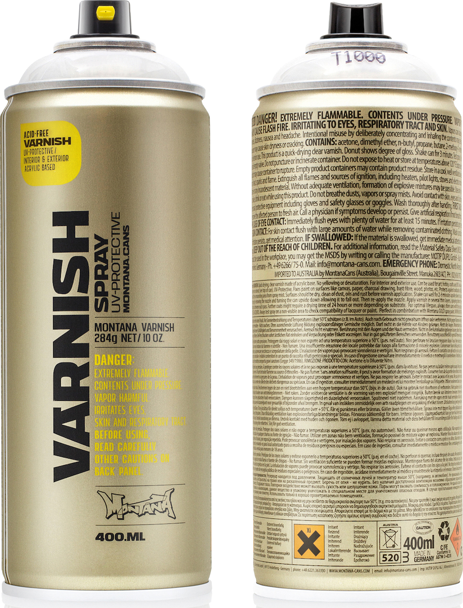 Χωρίς οξύ, γρήγορο στέγνωμα, διαυγές βερνίκι από ακρυλική βάση. Χωρίς κιτρίνισμα ή αποκορεσμό. Για εσωτερική και εξωτερική χρήση. Μπορεί να χρησιμοποιηθεί για έργα τέχνης, χόμπι, χειροτεχνίες και DIY. Διατίθεται σε γυαλιστερό, ημι-γυαλιστερό, ματ φινίρισμα. Επίπεδο στιλπνότητας που εμφανίζεται στο ντόνατ (δείτε την κορυφή του δοχείου) Προστατεύει και διορθώνει το χρώμα σε επιφάνειες όπως καμβά, χαρτί, κάρβουνο, ίνες ραβδιού, ξύλο, φωτογραφίες κ.λπ. Προστατεύει από την οξείδωση και την υπεριώδη ακτινοβολία. Όσο περισσότερα στρώματα εφαρμόζονται, τόσο ισχυρότερη είναι η UV προστασία. Κατά την εφαρμογή, προστατέψτε το αντικείμενο και τη γύρω περιοχή από το σπρέι. Οι επιφάνειες πρέπει να είναι στεγνές, καθαρές από σκόνη, λάδια και σκουριά πριν από την εφαρμογή του βερνικιού. Ανακινήστε καλά για 2-3 λεπτά ανάποδα για να επωφεληθείτε της βαρύτητας. Αφαιρέστε το δακτύλιο ασφαλείας αφαιρώντας το ακροφύσιο και γυρίζοντας το δοχείο ανάποδα επιτρέποντάς του να πέσει έξω. Στη συνέχεια, εφαρμόστε ξανά το ακροφύσιο. Εφαρμόστε βερνίκι σε αρκετά λεπτά στρώματα, ψεκάζοντας πριν το προηγούμενο στρώμα στεγνώσει πλήρως αλλά με 2 λεπτά μεταξύ κάθε περάσματος. Περαιτέρω στρώσεις μπορεί να απαιτούν χρόνο στεγνώματος 24 ωρών ή περισσότερο ανάλογα με το υπόστρωμα. Για βέλτιστη διάρκεια ζωής, αποθηκεύετε πάντα δοχεία με το ακροφύσιο ενεργοποιημένο. ΔΕΝ ΣΥΜΒΙΒΑΣΕΙ ΜΕ ΣΥΝΘΕΤΙΚΑ ΒΑΣΙΚΑ ΛΑΚΕΡΑ. Πάντα να ελέγχετε το σπρέι σε μια μη ορατή περιοχή για να ελέγχετε τη συμβατότητα της λάκας ή της βαφής.