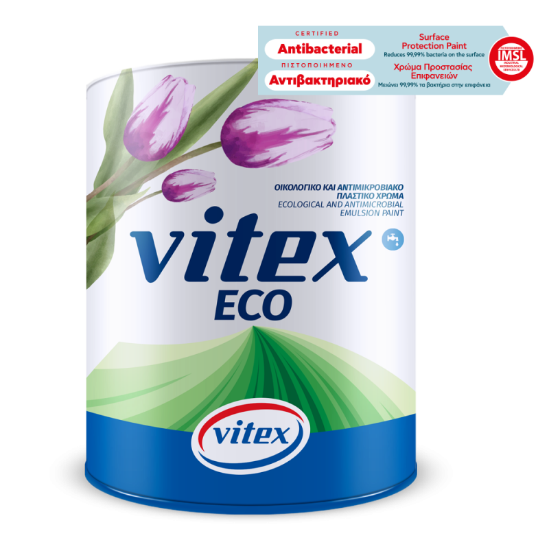 Πλαστικό οικολογικό και αντιμικροβιακό χρώμα υψηλής ποιότητας για χρήση σε εσωτερική τοιχοποιία. Πιστοποιημένο σύμφωνα με τα κριτήρια του Συμβουλίου Απονομής Οικολογικού Σήματος της Ε.Ε. και από το Industrial Microbiological Services Ltd Registered in England για την αντιμικροβιακή (αντιβακτηριακή) του δράση στην βαμμένη επιφάνεια, σύμφωνα με το πρότυπο ISO 22196 (Certifi cate No: IMSL 2020/04/055.3D). Το Vitex Eco λόγω της ειδικής του σύστασης αποτρέπει την ανάπτυξη μικροβίων στον υμένα του χρώματος. Μειώνει 99,99 τα παθογόνα βακτήρια (όπως E.coli κα Staphylococcus aureus) συμβάλλοντας σε πιο καθαρές και ανθεκτικές βαμμένες επιφάνειες. Είναι πολύ χαμηλής οσμής κατά και μετά την εφαρμογή. Σχεδόν μηδενικά ΠΟΕ. Συνεισφέρει στην καλύτερη ποιότητα αέρα και υγιεινή των εσωτερικών χώρων, λόγω των πολύ χαμηλών εκπομπών Πτητικών Οργανικών Ενώσεων. Είναι πιστοποιημένο με το Indoor Air Comfort GOLD, το πιο αυστηρό παγκόσμιο σύστημα αξιολόγησης εκπομπών σε εσωτερικούς χώρους