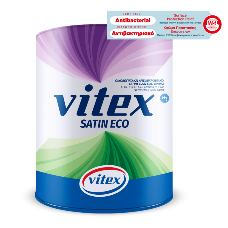 Το Vitex Satin Eco λόγω της ειδικής του σύστασης αποτρέπει την ανάπτυξη μικροβίων στον υμένα του χρώματος. Μειώνει 99,99% τα παθογόνα βακτήρια συμβάλλοντας σε πιο καθαρές κι ανθεκτικές βαμμένες επιφάνειες.