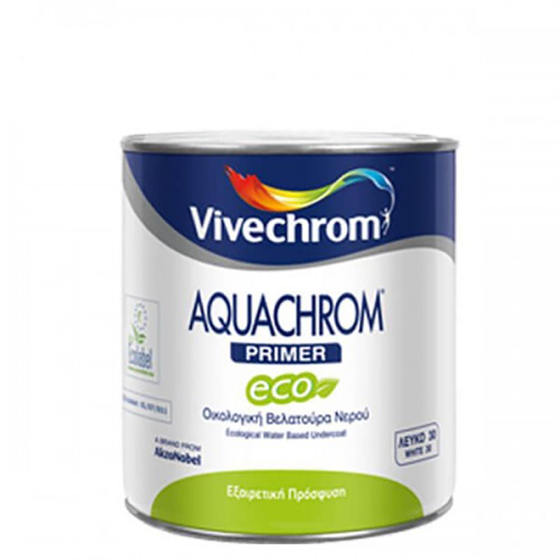 Το AQUACHROM PRIMER ECO είναι οικολογική βελατούρα νερού ιδανική για εσωτερικές ξύλινες επιφάνειες. Είναι πιστοποιημένο οικολογικό χρώμα και πληροί τα κριτήρια του Συμβουλίου Απονομής Οικολογικών Σημάτων της Ευρωπαϊκής Ένωσης. Παρουσιάζει εξαιρετική πρόσφυση σε παλαιά βερνικοχρώματα διαλύτου (ριπολίνες ή λαδομπογιές). Χάρη στην ειδική του σύνθεση προστατεύει το χρήστη και δε ρυπαίνει το περιβάλλον. Δεν περιέχει επικίνδυνες ουσίες, όπως βαρέα μέταλλα, ελεύθερη φορμαλδεΰδη, αρωματικούς υδρογονάνθρακες. Δουλεύεται εύκολα, τρίβεται θαυμάσια και έχει μεγάλη καλυπτικότητα. Εξασφαλίζει την τέλεια πρόσφυση του τελικού χρώματος. Είναι το ιδανικό υπόστρωμα για επιφάνειες που βάφονται με το οικολογικό βερνικόχρωμα νερού AQUACHROM ECO της Vivechrom.