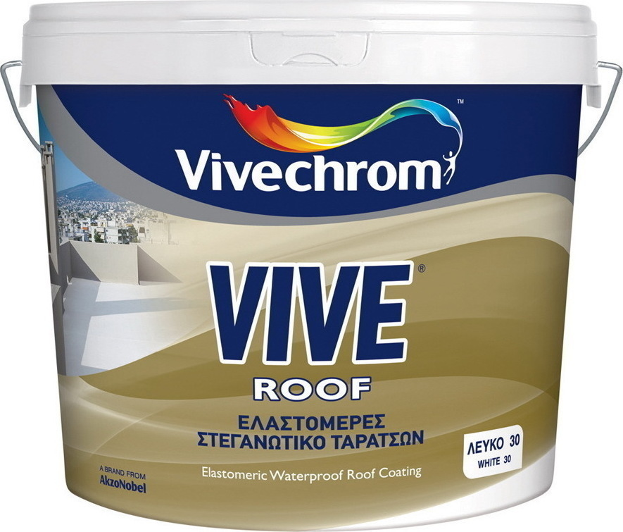 Το VIVE ROOF είναι υδατοδιαλυτό λευκό ελαστομερές στεγανωτικό χρώμα για ταράτσες, στηθαία, φωταγωγούς, στέγες με κεραμίδια και αποτελεί την οικονομική και αξιόπιστη λύση στη στεγάνωση. Έχει υψηλή ελαστικότητα και αντοχή στις δυσμενείς καιρικές συνθήκες. Το VIVE ROOF είναι πιστοποιημένο ψυχρό χρώμα απο το Εθνικό και Καποδιστριακό Πανεπιστήμιο Αθηνών με υψηλή τιμή ανακλαστικότητας (SR), υψηλό συντελεστή εκπομπής (ε) και υψηλό δείκτη ανακλαστικότητας απο την ηλιακή ακτινοβολία. Μειώνει σημαντικά τη θερμοκρασία της ταράτσας το καλοκαίρι από 3-5ο C μειώνοντας έτσι την ανάγκη χρήσης κλιματισμού και συμβάλλει στην εξοικονόμηση ενέργειας.