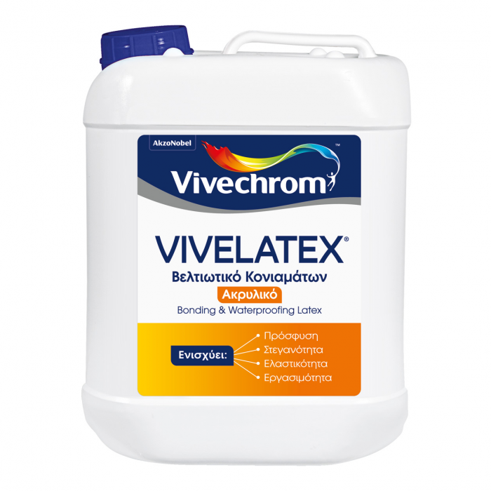 To VIVELATEX είναι ακρυλικό βελτιωτικό κονιαμάτων, το οποίο ενισχύει σημαντικά τις ιδιότητες σε τσιμεντοειδή κονιάματα. Αυξάνει την πρόσφυση σε κάθε μορφής υπόστρωμα. Βελτιώνει την ελαστικότητα και τη στεγανότητα, αποτρέποντας τις τριχοειδείς ρωγμές και τα σκασίματα σε τσιμεντοκονίες και επιχρίσματα. Βελτιώνει επίσης τη συγκράτηση νερού και την εργασιμότητα και περιορίζει τη συρρίκνωση κατά την πήξη του τσιμέντου. Είναι ιδανικό πρόσμεικτο για επιχρίσματα και σοβάδες τοιχοποιίας, τσιμεντοκονίες δαπέδων, κονιάματα εξομάλυνσης και επισκευαστικά και ως ενισχυτικό σε κόλλες πλακιδίων. Επίσης ως αστάρι σε χρώματα και στεγανωτικά ταρατσών και κυρίως σε στεγάνωση θεμελίων οικοδομών.