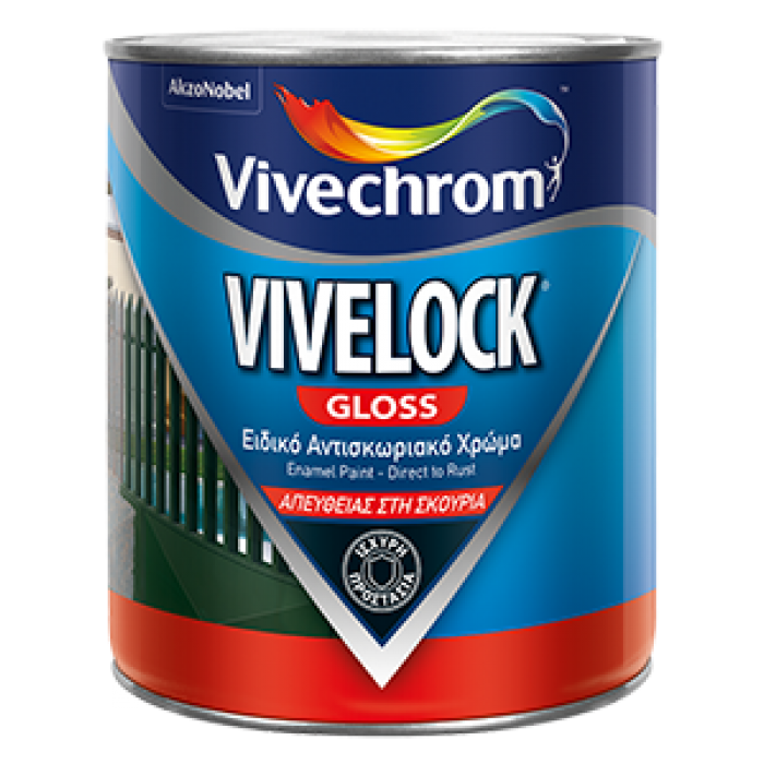 Το VIVELOCK GLOSS είναι ειδικό γυαλιστερό χρώμα, το οποίο εφαρμόζεται κατευθείαν σε σκουριασμένες μεταλλικές επιφάνειες χωρίς αντισκωριακό αστάρι. αποτελεί την εύκολη και αποτελεσματική λύση για τη σκουριά και την προστασία νέων ή παλαιών μεταλλικών επιφανειών, όπως πόρτες, κάγκελα και κάθε είδους σιδηροκατασκευές. Έχει ισχυρή πρόσφυση, μεγάλη σκληρότητα και πολύ καλό άπλωμα. Προσφέρει εξαιρετική αντιδιαβρωτική προστασία και όμορφο τελείωμα που διατηρεί τη στιλπνότητα και τις αποχρώσεις του αναλλοίωτες για μεγάλο χρονικό διάστημα.