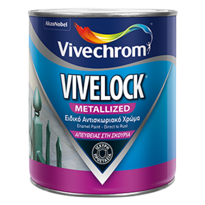 Το VIVELOCK METALLIZED είναι προστατευτικό και διακοσμητικό χρώμα που εφαρμόζεται κατευθείαν σε κουριασμένες μεταλλικές επιφάνειες, χωρίς την ανάγκη αντισκωριακού ασταριού, και δίνει στη βαφόμενη επιφάνεια ένα θαυμάσιο σαγρέ ματ μεταλιζέ φινίρισμα. Έχει επίσης καλή πρόσφυση και σε γαλβανισμένες επιφάνειες. Αποτελεί την εύκολη και αποτελεσματική λύση για τη διακόσμηση, προστασία και ανανέωση μεταλλικών επιφανειών, εσωτερικά και εξωτερικά του σπιτιού και των σύγχρονων κτιρίων, όπως πόρτες, κάγκελα, κουπαστές, κολόνες, μικροαντικείμενα. Προσφέρει εξαιρετική αντιδιαβρωτική προστασία και οι αποχρώσεις του παραμένουν αναλλοίωτες για μεγάλο χρονικό διάστημα. Παρουσιάζει ισχυρή πρόσφυση, πολύ καλό άπλωμα και δίνει ένα εντυπωσιακό αποτέλεσμα.