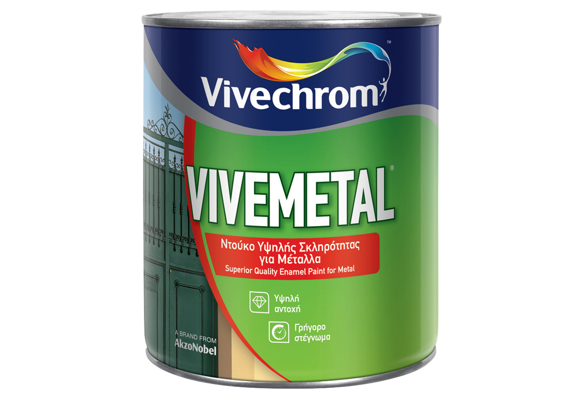 Το VIVEMETAL είναι ντούκο μεγάλης σκληρότητας και υψηλής αντοχής για μέταλλα. Είναι ιδανικό χρώμα για πόρτες, κάγκελα, σιδηροκατασκευές, εργαλεία, μηχανήματα και για κάθε επιφάνεια όπου είναι επιθυμητό ένα αξεπέραστο γυαλιστερό ή σατινέ φινίρισμα. Στεγνώνει γρήγορα και διατηρεί τη γυαλάδα και την απόχρωση του ακόμα και στις πιο δυσμενείς καιρικές συνθήκες. Με την προσθήκη σκληρυντή VIVEHARD επιτυγχάνεται γρηγορότερο στέγνωμα και πολύ μεγαλύτερη σκληρότητα. ∆ιατίθεται σε λευκό, μαύρο καθώς και σε πλήρη γκάμα των αποχρώσεων RAL αλλά και σε απεριόριστες αποχρώσεις μέσω του συστήματος XΡΩΜΟΣΥΝΘΕΣΕΙΣ της Vivechrom σε συσκευασίες των 750ml & 2,5lt.